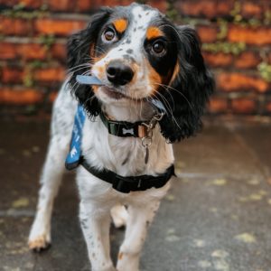 Bringsel – a bringsel is a stuffed cylinder or a tab that the dog holds in their mouth. It can be velcroed onto someone’s beltloop or it can hang on the dog’s collar, depending on the need. The benefit to a bringsel is it is extremely distinct – the dog only holds it when it is alerting and it very clearly shows the need to test your blood sugar. If the bringsel hangs on your beltloop, you will always know when the dog is alerting because it is coming to you and pulling it off, but not all clothing has beltloops which can cause confusion for the dog if the bringsel is not available. I have had more success with hanging the bringsel on the dog’s collar using a carabiner or using a training tab that clips onto the dog’s collar. Bringsels require more training and the behavior is less natural for the dog, but that is also why it is an extremely clear alert.